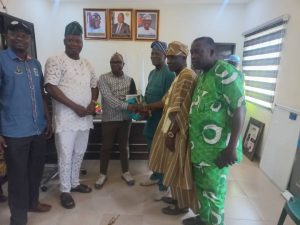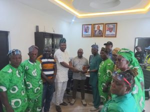 Muhideen Kareem,the Special Adviser,Hon.Edalere Olusola and the HOD,Mr. Balogun Jelili led Farmers and others yesterday in the presentation of the four Awards received to the Council’s Executive Chairman,Hon. (Engr.) Abdullahi Sesan Olowa in his office.